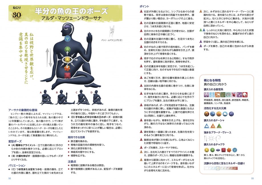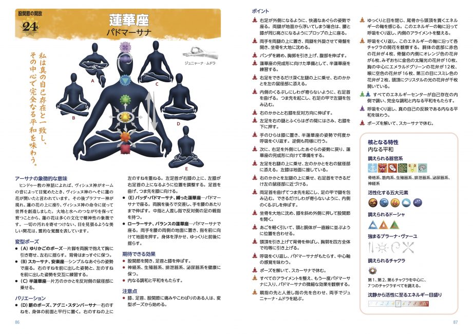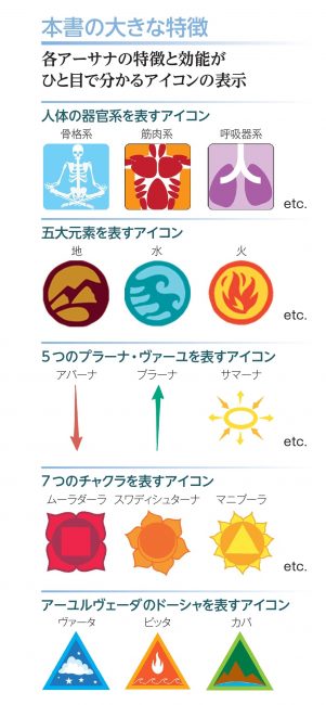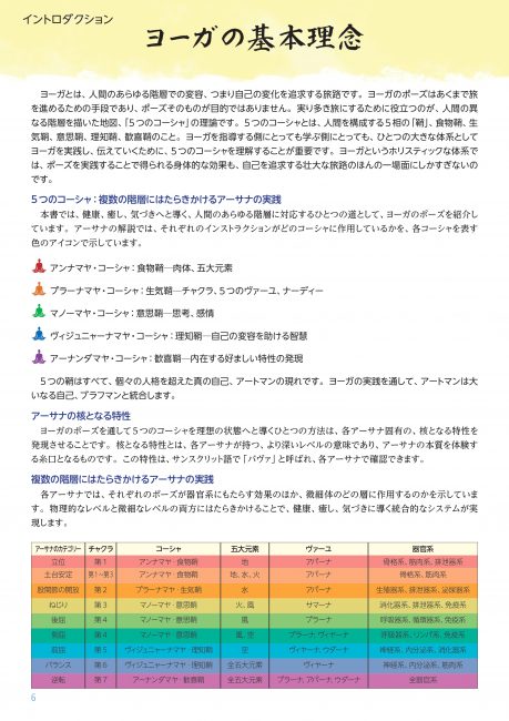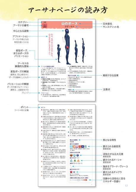 イントロダクション部分では、5つのコーシャ、身体器官系、アーユルヴェーダ、チャクラ、グナ、5つのヴァーユ、バンダ、ヨーガの八支則について詳しく紹介しています。さらに、今まで結びつき得なかったそれらの効能が、あらゆるエネルギーの方向によりアーサナと融合し、これまでに類を見ない奥深い構成となっているのも本書の魅力の一つです。その他、全身を動かすためのウォームアップと、初級、中級、上級の各レベルに対応した3種類のアーサナシークエンスも収録されています。