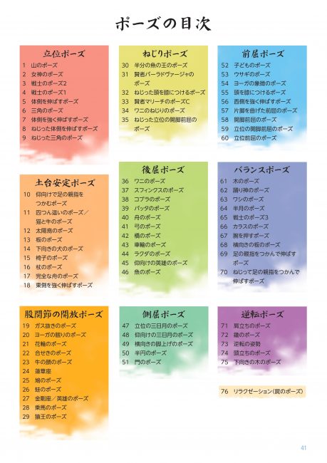 76種類のアーサナはカテゴリーごとに分類され、それぞれ以下の内容を記載しています。
