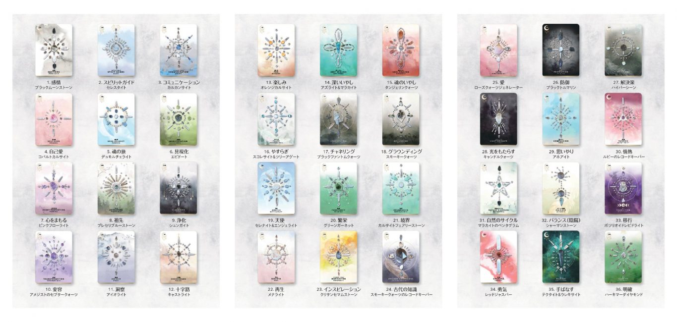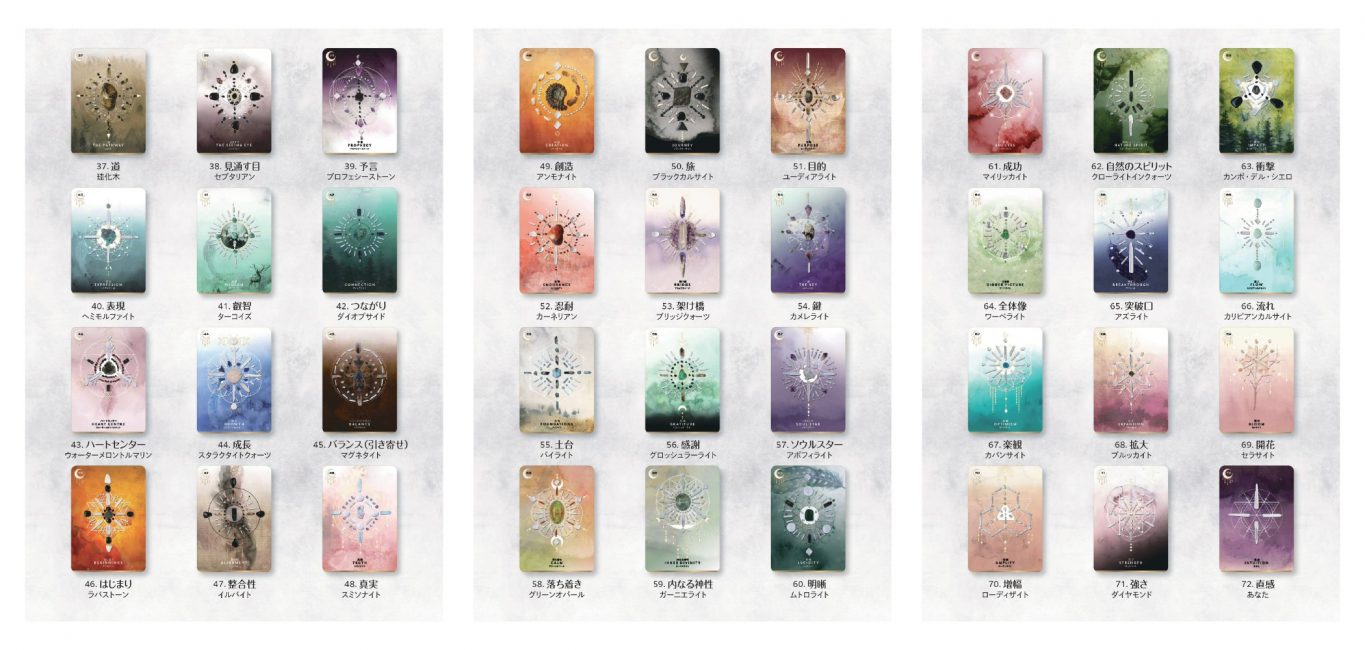 ガイドブックでは72枚のカードごとに、クリスタルがもつ主要なキーワードと、カードがあなたに求めていることをより深く理解するためのワークが紹介されています。