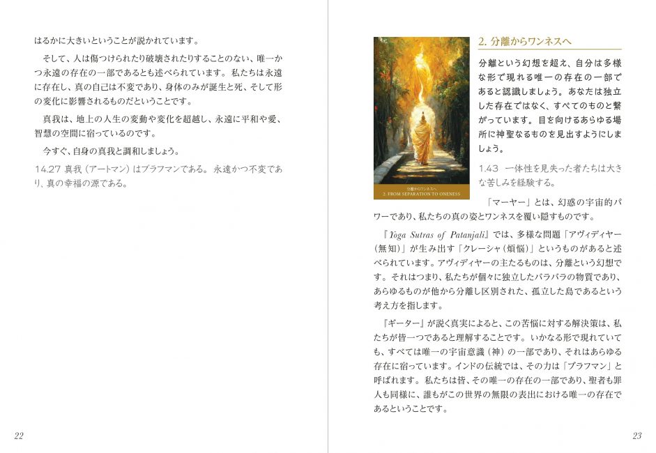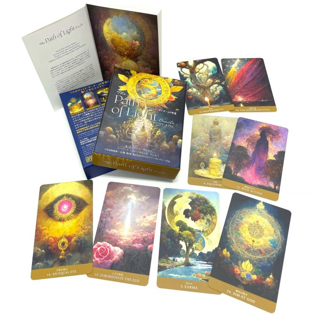 『パス オブ ライト・オラクル』は、その叡智を現代的な感性と直感の世界に融合させた、まったく新しいオラクルカードセットです。本作では、『ギーター』に息づくカルマ・ヨーガ(行為のヨーガ)、バクティ・ヨーガ(愛と献身のヨーガ)、そしてジュニャーナ・ヨーガ(智慧のヨーガ)のエッセンスを、カードの言葉とアートワークを通して体現しています。