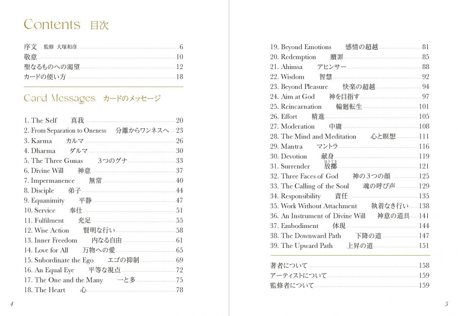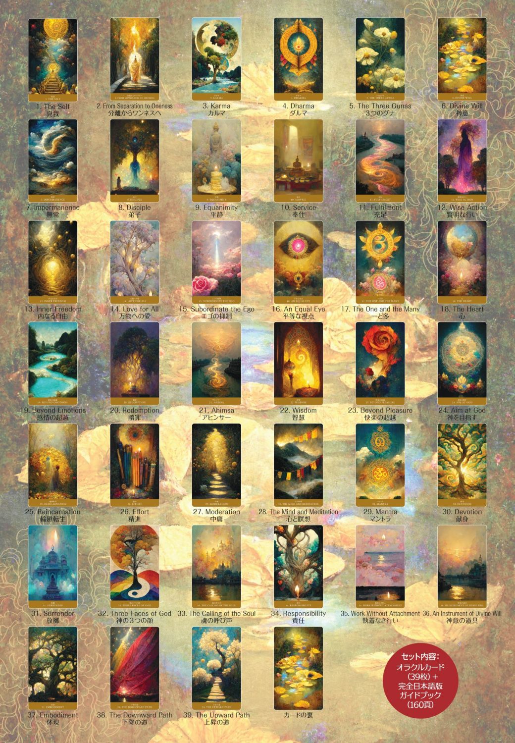本セットには、超越的な美しさと霊的な象徴性をもつ39枚のカードと、『バガヴァッド・ギーター』の哲学をやさしく紐解いた完全日本語版ガイドブック(オールカラー160ページ)を収録。原著の霊的なニュアンスと詩的表現を忠実に再現しながら、日本の読者の感性に響くよう丁寧に翻訳されています。